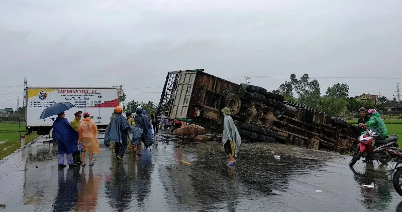 Hàng chục con heo bị chết và hàng trăm con heo trên xe tải đổ xuống chạy dọc đường. Vụ tai nạn làm ách tắc giao thông kéo dài.