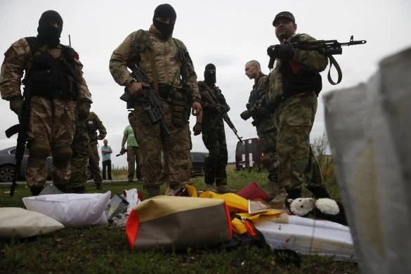 Lực lượng ly khai nhìn vào đồ đạc của hành khách tại địa điểm vụ tai nạn của chuyến bay Malaysia Airlines MH17, gần khu định cư của Grabovo trong khu vực Donetsk, 18 Tháng Bảy 2014.
