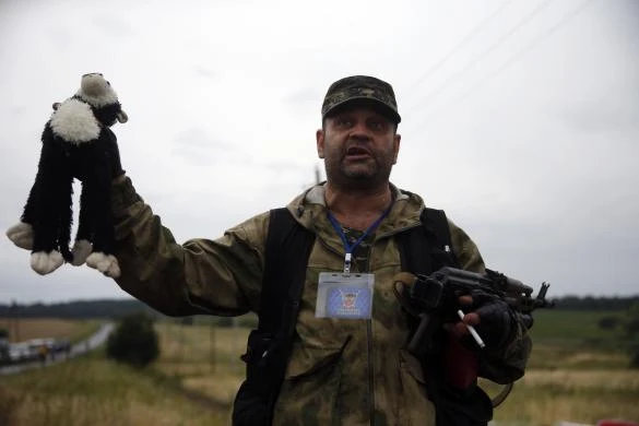Một người lính của lực lượng ly khai đang nắm giữ một đồ chơi nhồi bông được tìm thấy tại trang hiện trường chiếc máy bay MH17 , gần khu định cư của Grabovo trong khu vực Donetsk, 18 Tháng Bảy 2014.