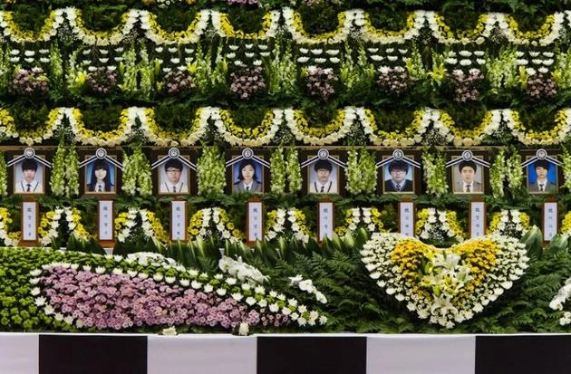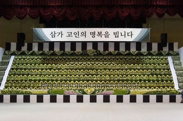 Một bàn thờ chung vừa được dựng lên tại phòng tập thể thao của một sân vận động ở thành phố Ansan, nơi tọa lạc của trường cấp ba Danwon. Ảnh: AFP.