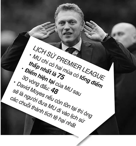 Đầu tiên là kỷ lục sau 35 năm, lần đầu tiên MU thất bại trước West Brom trên sân Old Trafford. Tiếp theo là trận thua Everton 0-1 trên sân Old Trafford cũng là lần thắng đầu tiên của đối thủ đàn em này ở thánh địa của MU. Chưa hết, cũng tại Old Trafford, MU lần đầu tiên thua Newcastle sau 41 năm. Sang đến trận MU thua Olympiakos 0-2 cũng là lần đầu tiên một đội bóng Hy Lạp thắng MU ở đấu trường châu Âu. Nay sau trận thua Liverpool 0-3, ông David Moyes lại sắp nhận thêm một kỷ lục tệ hại nhất với MU trong lịch sử Premier League.