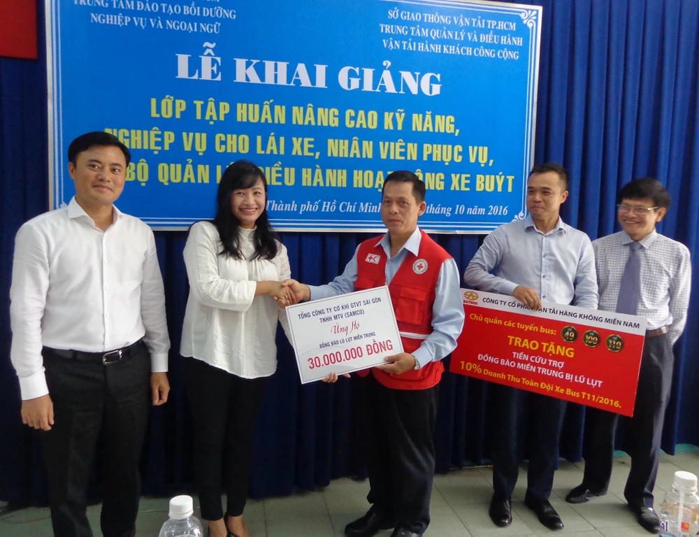 Cũng tại buổi khai giảng, Tổng Công ty Cơ khí giao thông vận tải Sài Gòn (Samco) đã trao 30 triệu đồng ủng hộ đồng bào bị lũ lụt ở miền Trung. Riêng Công ty CP Vận tải hàng không Miền Nam (Satco) cam kết sẽ trích 10% doanh thu từ các chuyến xe buýt vàng (chạy tuyến sân bay Tân Sơn Nhất - Bến xe Miền Tây) chạy trong tháng 11 ủng hộ đồng bào miền Trung.