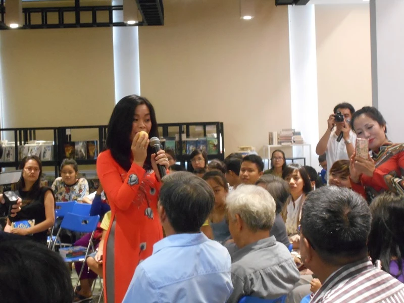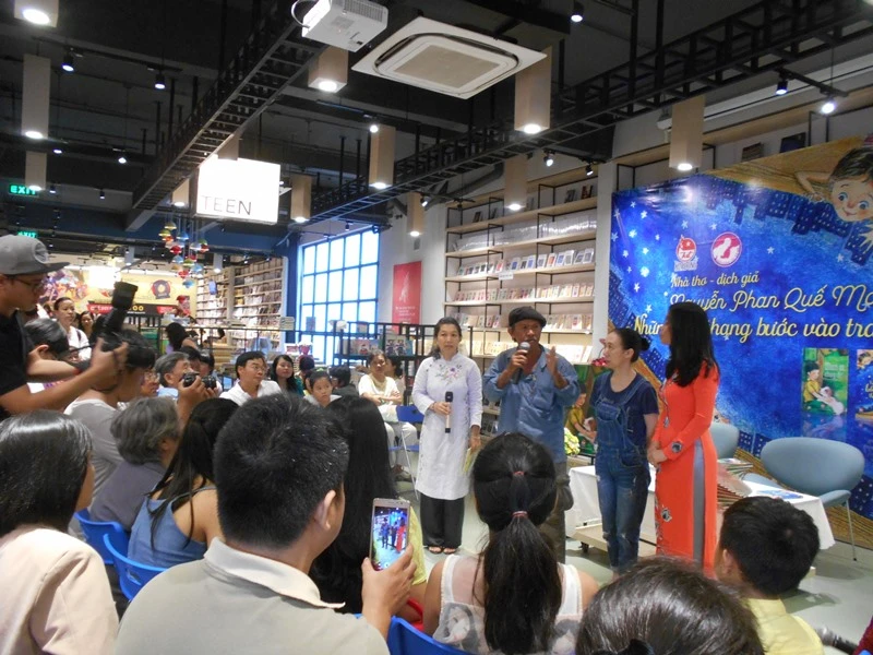 Nhà thơ - dịch giả Nguyễn Phan Quế Mai giao lưu với mọi người bằng những câu chuyện thực tế về tuổi thơ. Ảnh: THANH TUYỀN