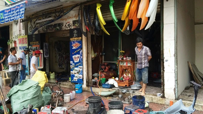 Lửa bốc lên tại một cửa hàng sơn xe nằm dưới khu cư xá khiến người dân hoảng hốt tháo chạy