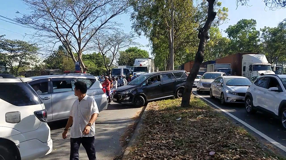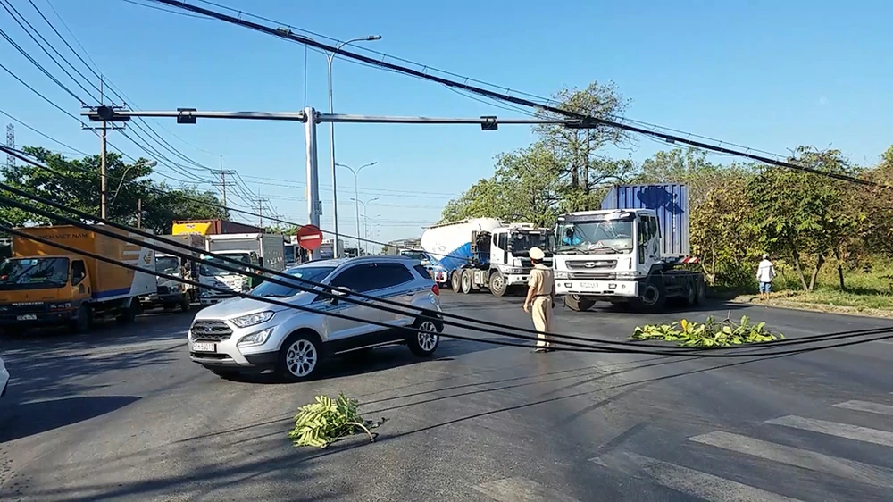 Sự cố khiến hệ thống dây điện 220V chắn ngang đường Nguyễn Văn Linh, các phương tiện kích thước lớn không dám lưu thông qua gây ùn tắc, kẹt xe.