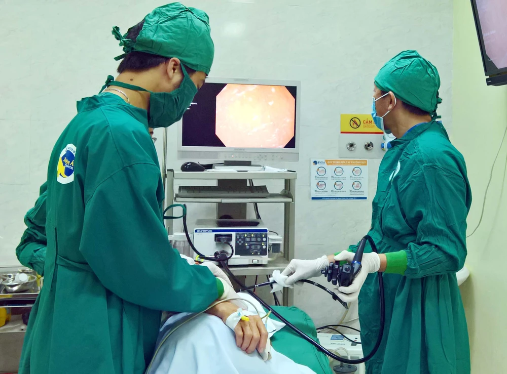 Các BS đang nội soi lấy dây đồng hồ khỏi người bé T. Ảnh: LÊ PHỤNG