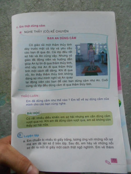 Cuốn sách Thực hành kỹ năng sống dành cho học sinh (HS) lớp 1 của NXB Giáo dục Việt Nam đang gây nhiều phản ứng từ cộng đồng mạng. Ở bài 15 dạy trẻ về lòng dũng cảm với nội dung “Vượt qua nỗi sợ” kể về câu chuyện “Bạn An dũng cảm” (trang 77), sách viết: “Cô giáo rải một thảm thủy tinh dày trước mặt cả lớp và yêu cầu các bạn đi qua đó. Cả lớp đều rất sợ hãi và An cũng vậy. Nhưng cô giáo đã động viên và hướng dẫn giúp An tự tin đi qua thảm thủy tinh một cách dễ dàng. Khi đi qua rồi, An thấy thảm thủy tinh không đáng sợ như mình nghĩ và An quay lại động viên các bạn để các bạn dũng cảm như An. Cuối cùng cả lớp đều dũng cảm đi qua thảm thủy tinh” (!).