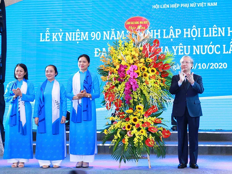 Ủy viên Bộ Chính trị, Thường trực Ban bí thư Trần Quốc Vượng (phải) tặng hoa chúc mừng Hội Liên hiệp Phụ nữ Việt Nam. Ảnh: TTXVN