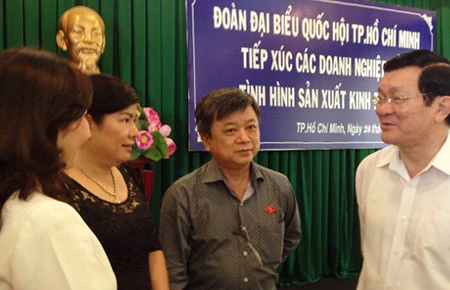 Chủ tịch nước Trương Tấn Sang trao đổi với các đại biểu tại buổi làm việc sáng 28-6. Ảnh: P.ĐIỀN