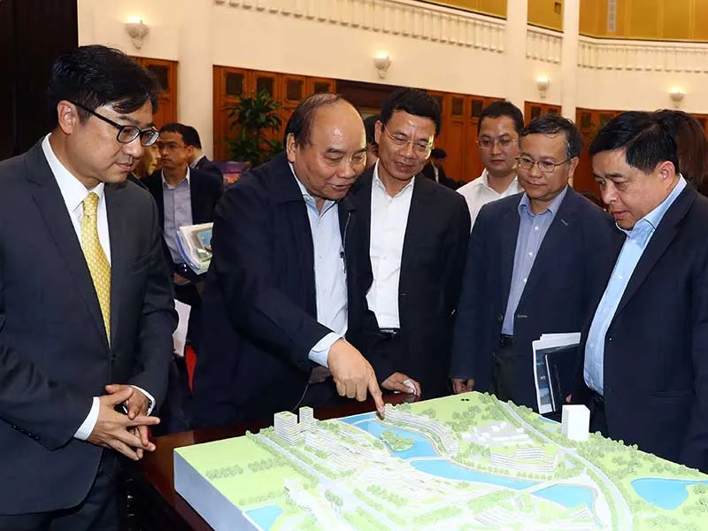 Thủ tướng Nguyễn Xuân Phúc và các đại biểu xem mô hình trung tâm đổi mới sáng tạo quốc gia. Ảnh: TTXVN