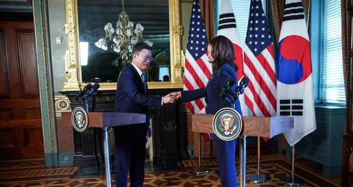 Phó Tổng thống Mỹ Kamala Harris có cuộc gặp với Tổng thống Hàn Quốc Moon Jae-in tại thủ đô Washington D.C hôm 21-5. Ảnh: RT