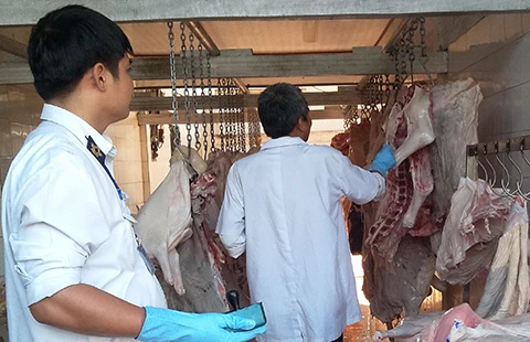 Cơ quan thú y kiểm tra lô thịt heo từ các tỉnh đưa vào TP.HCM tiêu thụ. Ảnh: Quang Huy
