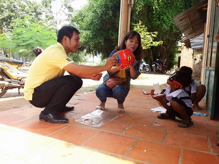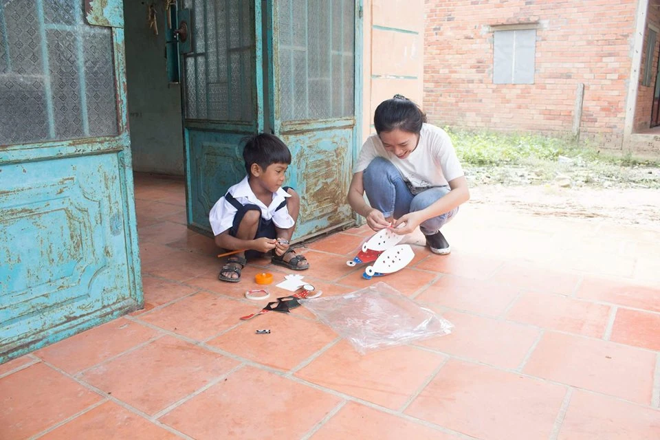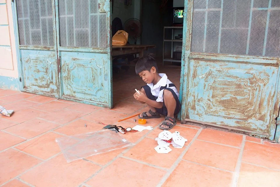 Học sinh lớp nhỏ hơn sẽ được phụ huynh và giáo viên hướng dẫn. Cậu bé này tên Duốc Kha, học sinh Khmer, đang học lớp 1, đã chạy ù về nhà để mở hộp lồng đèn. Nhưng cậu bé loay hoay mãi vẫn chưa xếp được hình lồng đèn siêu nhân