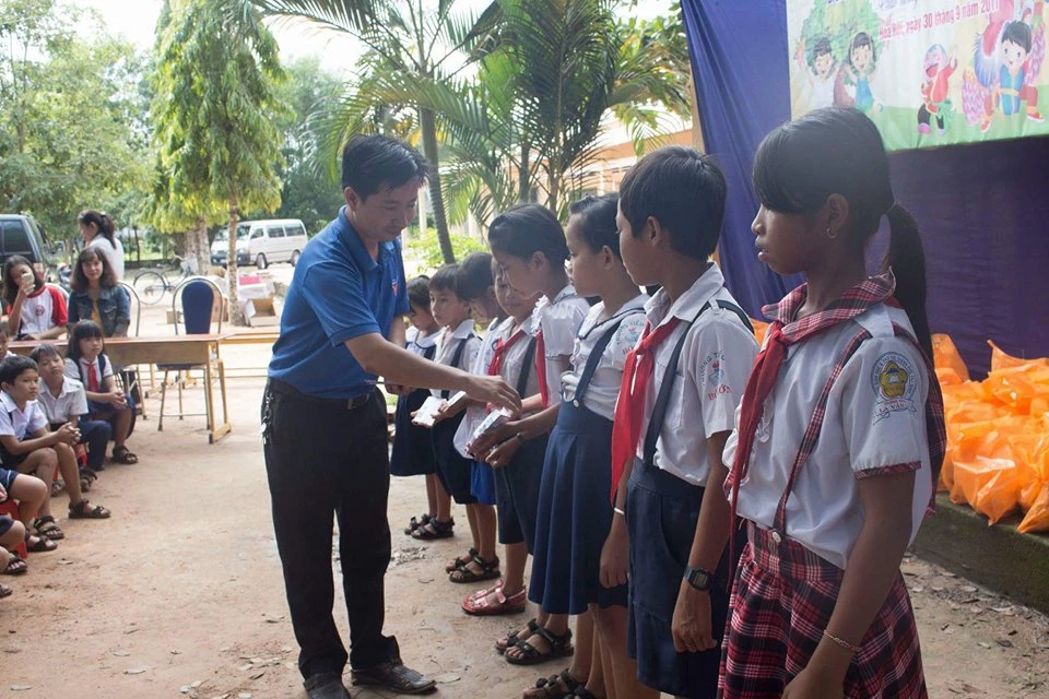 Anh Vũ Hải, bí thư chi đoàn Đài PTTH Tây Ninh trao học bổng cho tám em nhỏ có hoàn cảnh khó khăn