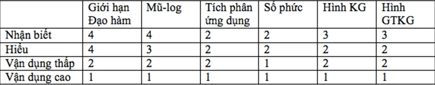 Chú ý đầu tiên là năm nay nội dung thi nằm hoàn toàn trong chương trình 12. Cụ thể, theo đề thi minh họa thì cấu trúc đề thi như sau: Có 11 câu thuộc chủ đề Ứng dụng của đạo hàm và giới hạn trong khảo sát hàm số, 10 câu thuộc chủ đề Hàm số mũ và logarit, 7 câu thuộc chủ đề Tích phân và ứng dụng, 6 câu Số phức, 8 câu thuộc 2 chương của Hình học không gian là Khối đa diện và thể tích và Mặt cầu, mặt trụ, mặt nón và 8 câu thuộc chủ đề Hình giải tích trong không gian. Các câu hỏi có mức độ khó dễ khác nhau mà theo thang phâng loại tương đối có 4 mức độ: Nhận biết, Hiểu, Vận dụng thấp và Vận dụng cao. Dựa vào đề thi minh họa, chúng tôi tạm chia một cách tương đối ma trận đề như sau: