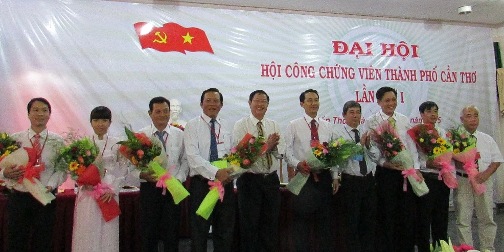 Ban chấp hành Hội Công chứng viên TP Cần Thơ khóa I nhận hoa chúc mừng từ lãnh đạo Cục Công tác phía nam và UBND TP Cần Thơ. Ảnh: N.NAM