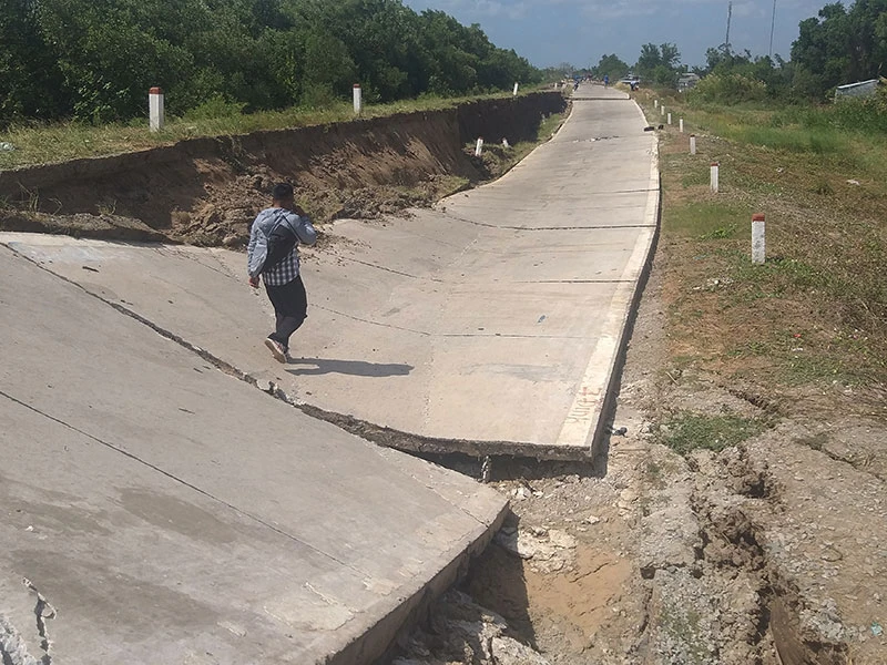 | Đã xảy ra nhiều vụ sạt lở Thời gian qua có nhiều vụ sụt lún đường bê tông vĩnh cửu trên đê biển Tây Cà Mau. Vụ gần nhất xảy ra hồi tháng 2-2020, tại khu vực ấp Kinh Hòn, xã Khánh Bình Tây, huyện Trần Văn Thời, Cà Mau. Chỉ sau một đêm, 180 m đường trên đê nơi đây đã sụt lún sâu xuống lòng đất. Trong đó, đoạn sụt nghiêm trọng dài khoảng 100 m, sụt sâu gần 2 m so với hiện trạng. Trước đó, vào tháng 8-2017, tại xã Khánh Tiến, huyện U Minh, Cà Mau, 130 m đường trên đê mới làm xong đã sụt lún, nơi sâu nhất gần 2 m. Những kết luận ban đầu của cơ quan chức năng tỉnh Cà Mau về nguyên nhân sụt lún đường trên đê biển Tây Cà Mau là do hạn hán, biến đổi khí hậu. |