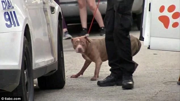 Một trong số 3 con chó còn sống và đang bị dẫn giải về đồn. Ảnh: 6ABC