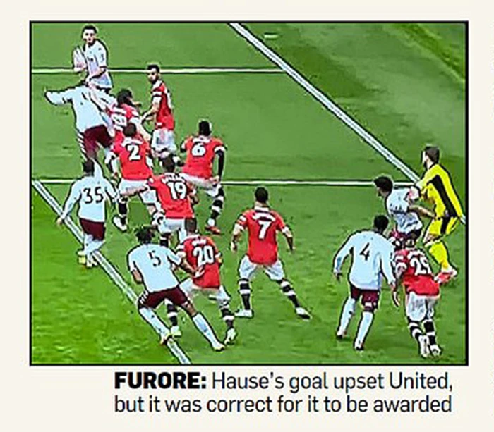 Tình huống Watkins ngăn cản De Gea và rơi vào thế việt vị khi Hause đánh đầu ghi bàn. ẢNH: DAILY MAIL