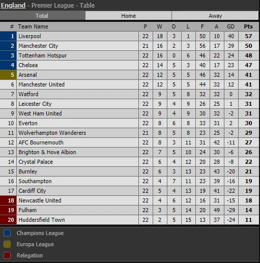 Hiện MU đã bắt kịp đội thứ 5 là Arsenal về điểm số. Cả hai đội có cùng 41 điểm nhưng Arsenal vẫn giữ vị trí thứ 5 nhờ hơn hiệu số bàn thắng bại. MU và Arsenal thua đội xếp thứ tư Chelsea 6 điểm.