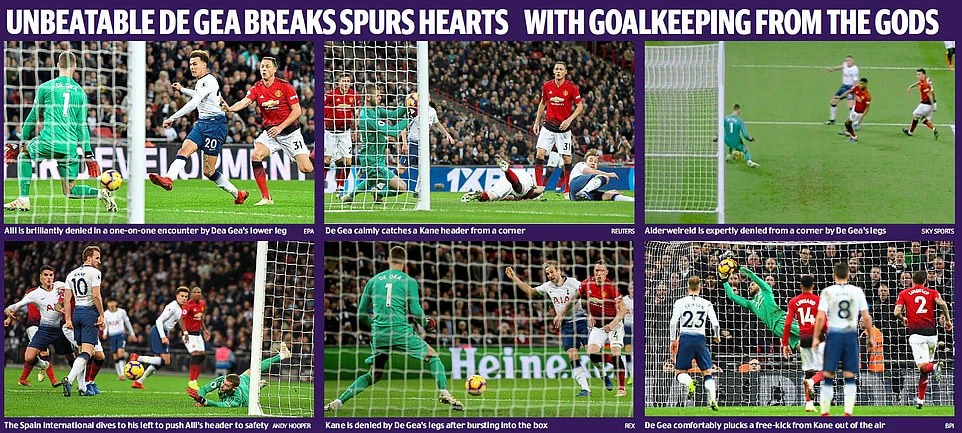 Đây là hiệp đấu mà De Gea chơi như lên đồng khi từ chối đến 7,8 cơ hội rõ ràng có thể ghi bàn của Tottenham. De Gea vừa bay lượn trong khung thành, vừa dùng chân cản phá không tưởng khiến những Kane, Dede Alli, Toby Alderweireld,... chỉ biết ôm đầu không hiểu vì sao mình dứt điểm như vậy mà vẫn không có bàn thắng. Không ngạc nhiên khi sau trận đấu, De Gea được bầu là cầu thủ xuất sắc nhất trận đấu.