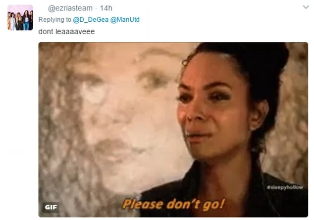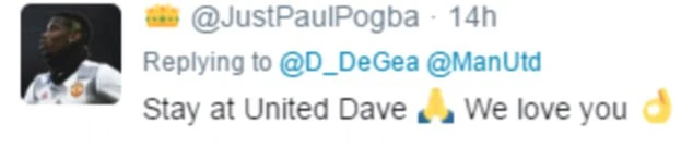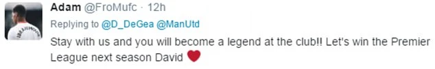 Một số CĐV MU viết trên Twitter, “Đừng đi Madrid! Hãy nhìn những gì họ làm với Casillas. Ở đây và trở thành huyền thoại của chúng tôi” hoặc “Hãy ở lại với chúng tôi và trở thành huyền thoại của CLB. Hãy giành chức vô địch Premier League mùa tới, David”.