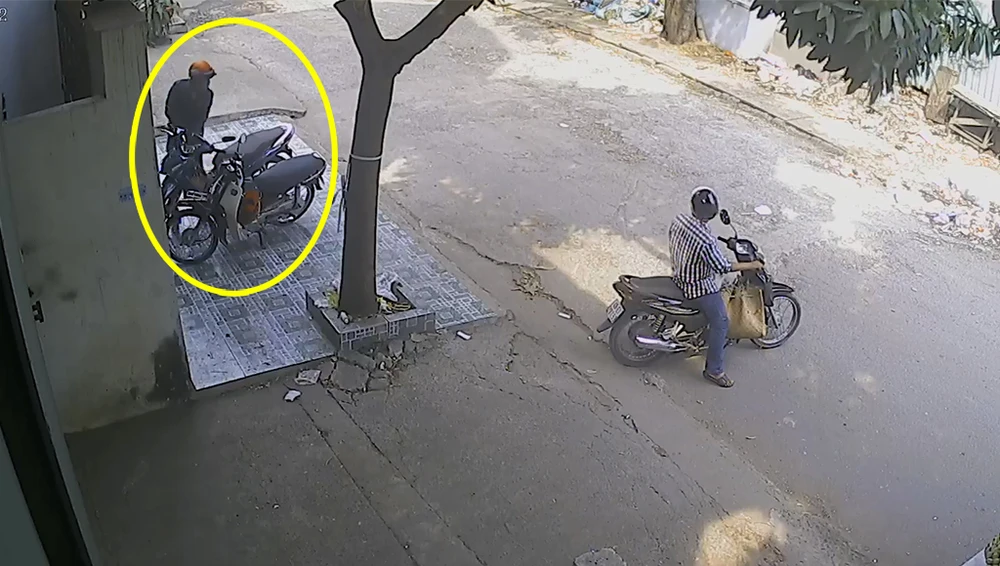 Liền đó, hai người đàn ông đi xe máy đảo qua khu vực như tìm kiếm gì đó. Khi thấy chiếc xe máy dựng trên vỉa hè không người trông coi nên một người cảnh giới, một người tiếp cận.