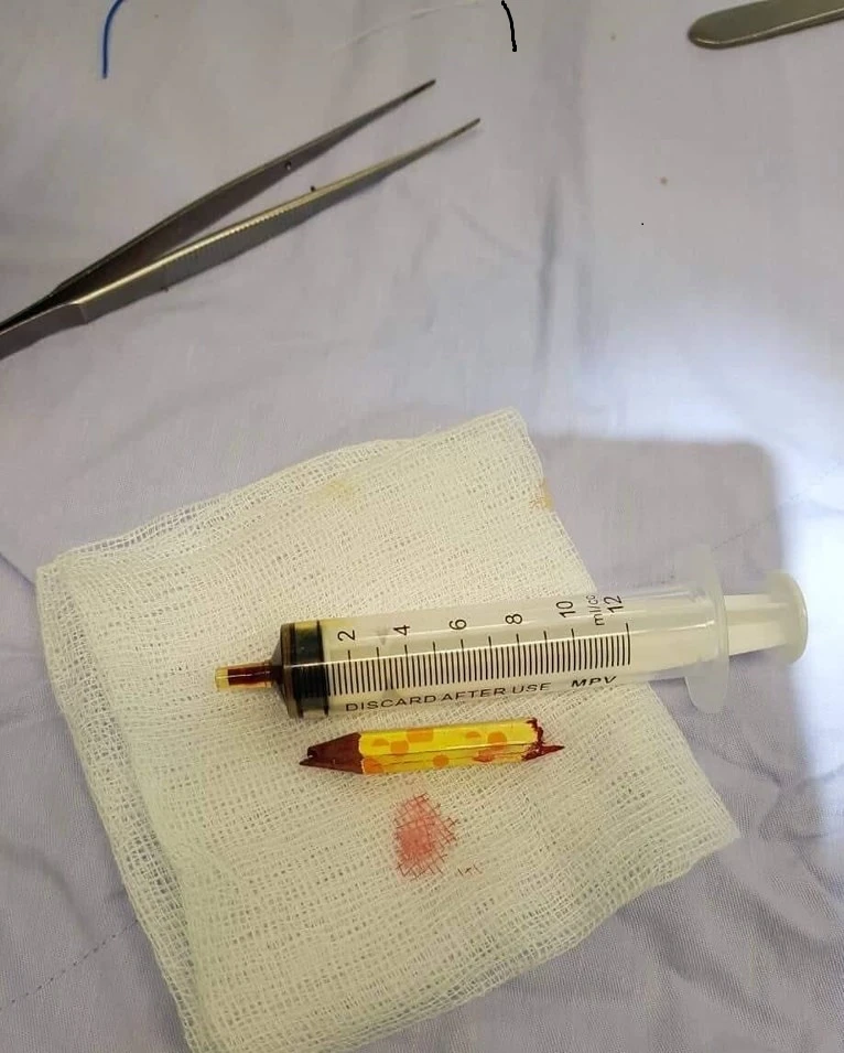 Tại phòng mổ, bác sĩ rạch da ngang mũi khoảng 2cm, quan sát thấy đuôi cây bút chì nằm sâu 1cm dưới da, bóc tách dần qua các lớp mỡ, cơ, đường đi khá dài và sâu xuống gần khoé môi trên. May mắn cho bệnh nhân này là dị vật đi ngang dọc theo các cơ bám da mũi trái, phải nên không ảnh hưởng đến các mạch máu, thần kinh.