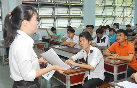 Cán bộ coi thi nhắc nhở các quy định trong phòng thi cho thí sinh tại Hội đồng thi Trường ĐH Khoa học tự nhiên TP.HCM trong đợt thi vừa qua. Ảnh: HTD