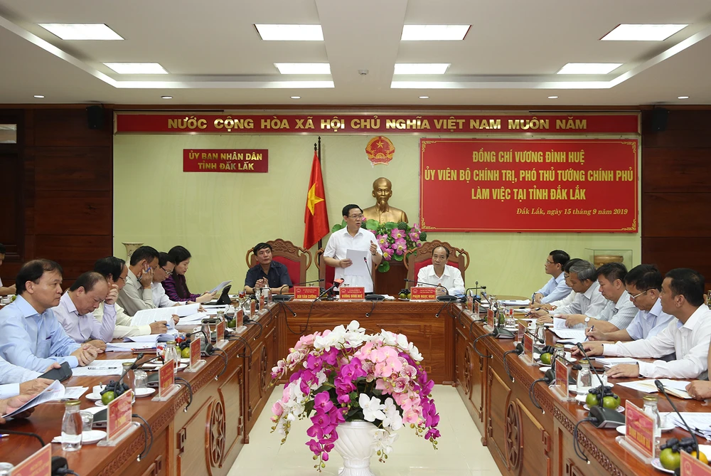 Ngày 15-9, tại thành phố Buôn Ma Thuột, Phó Thủ tướng Vương Đình Huệ và lãnh đạo các bộ, ngành Trung ương đã làm việc với lãnh đạo tỉnh Đắk Lắk về tình hình phát triển kinh tế, xã hội và thực hiện các nghị quyết của Trung ương và Chính phủ về xây dựng nông thôn mới, kinh tế tập thể và sắp xếp, đổi mới, phát triển các nông lâm trường.