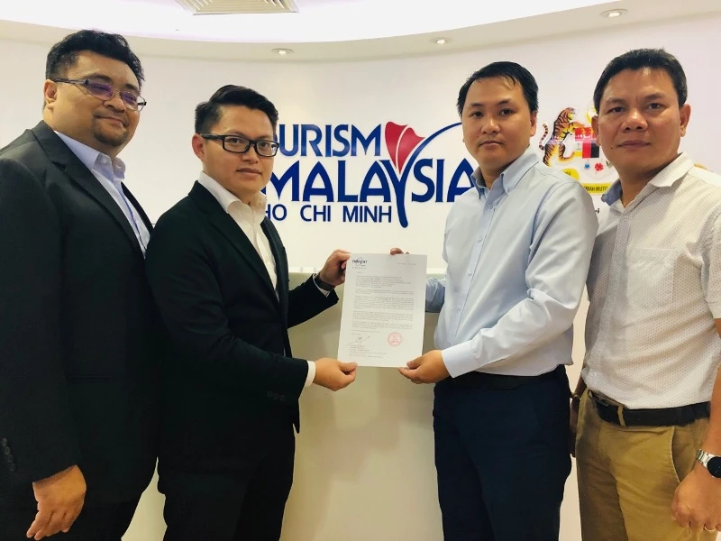 Đại diện Tổng cục Du lịch Malaysia tại Việt Nam (trái) nhận văn bản kiến nghị của lãnh đạo Công ty du lịch TransViet.