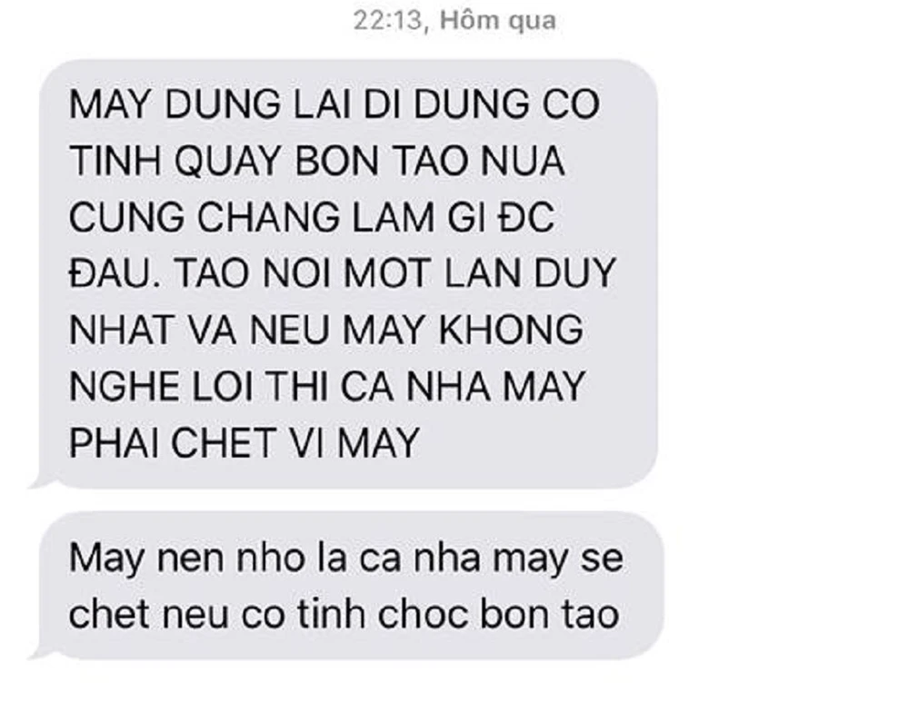 Cụ thể, vào khoảng 22 giờ ngày 2-12, PV Liên Liên nhận được hai tin nhắn từ số điện thoại +845846579.xx với nội dung “"May nen nho la ca nha may se chet neu co tinh choc bon tao" và "MAY DUNG LAI DI DUNG CO TINH QUAY BON TAO NƯA, CUNG CHANG LAM DƯƠC GI DAU. TAO NOI MOT LAN DUY NHAT VA NEU MAY KHONG NGHE LOI THI CA NHA MAY PHAI CHET VI MAY".