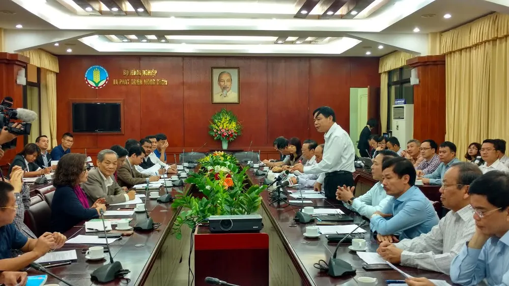 Bộ trưởng Bộ NN&PNT Nguyễn Xuân Cường chủ trì nêu các giải pháp giải cứu thị trường thịt lợn. Ảnh: Đ. TRUNG
