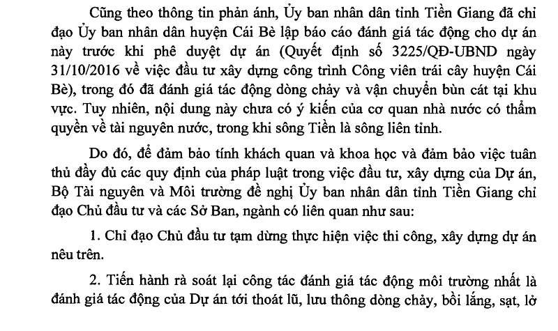 Để đảm bảo tính khách quan, khoa học và tuân thủ đầy đủ quy định của pháp luật trong việc đầu tư, xây dựng, Bộ TN&MT đề nghị UBND tỉnh Tiền Giang rà soát công tác đánh giá tác động môi trường, nhất là đánh giá tác động của dự án công viên tới việc thoát lũ, lưu thông dòng chảy, bồi lắng, sạt, lở…