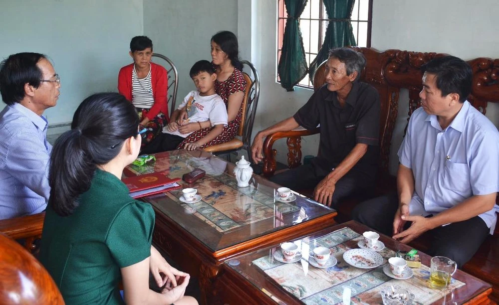 Ông Trần Hữu Thế, Phó chủ tịch UBND tỉnh Phú Yên (thứ hai từ phải qua) thăm hỏi, động viên gia đình ngư dân Lê Văn Reo. Ảnh: NC