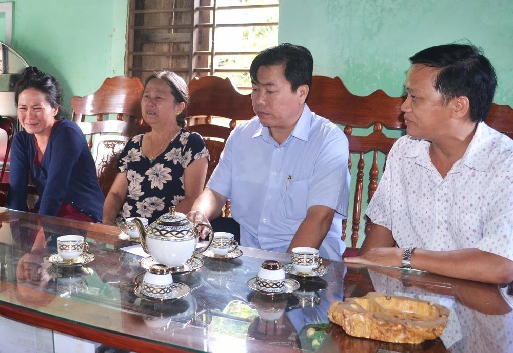 Ông Trần Hữu Thế, Phó chủ tịch UBND tỉnh Phú Yên (bìa phải) thăm hỏi, động viên gia đình ngư dân Phan Ngọc Liêm. Ảnh: NC