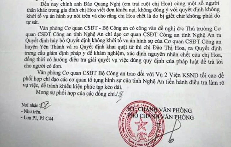 Công văn của Tổng cục Cảnh sát đề nghị Văn phòng Cơ quan CSĐT Bộ Công an đề nghị thủ trưởng Cơ quan CSĐT tỉnh Nghệ An chỉ đạo Cơ quan CSĐT Công an tỉnh Nghệ An ra quyết định hủy bỏ quyết định không khởi tố vụ án hình sự của Cơ quan CSĐT Công an huyện Yên Thành và ra quyết định khai quật tử thi chị Đào Thị Hoa, trưng cầu giám định pháp y để xác định nguyên nhân cái chết của chị Hoa.