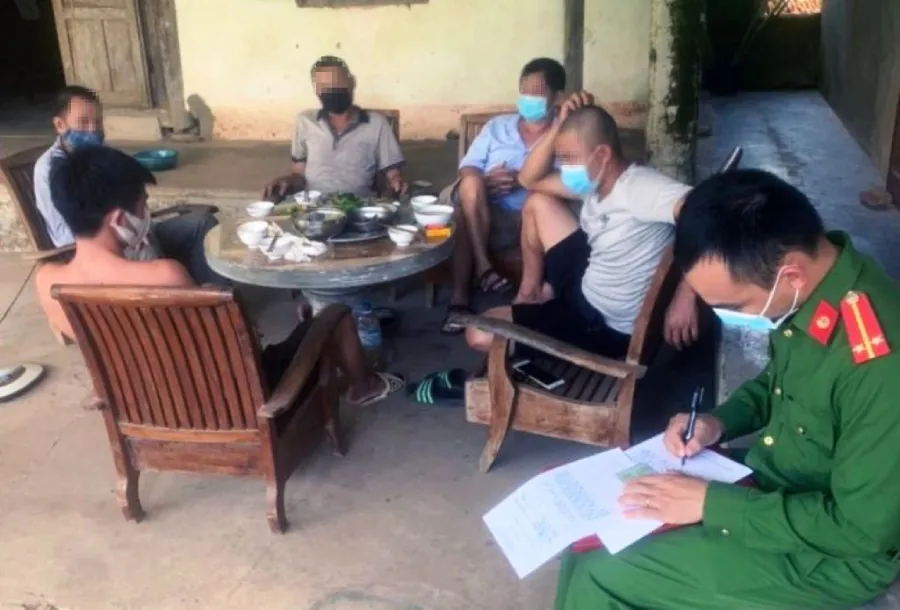 Khi ông T., anh HVD (29 tuổi) và HVQ (34 tuổi), ông ĐQD (55 tuổi), ông LTK (54 tuổi) đang ăn nhậu thì công an phát hiện, lập biên bản.