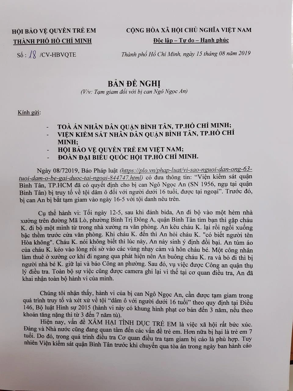 Ngày 15-8, Hội Bảo vệ quyền trẻ em TP.HCM có đơn đề nghị TAND quận Bình Tân, TP.HCM thực hiện thủ tục tạm giam đối với bị cáo Ngô Ngọc An (SN 1956, ngụ Bình Tân) bị truy tố về tội dâm ô đối với người dưới 16 tuổi.