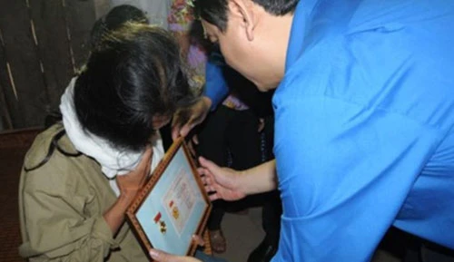 Thay mặt Ban Bí thư TƯ Đoàn, anh Nguyễn Đắc Vinh truy tặng Huy hiệu “Tuổi trẻ dũng cảm” cho em Nguyễn Anh Tuấn và bà Nguyễn Thị Kim thay mặt con đón nhận Huy hiệu “Tuổi trẻ dũng cảm”.