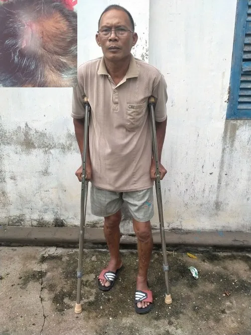 Ông Nguyễn Văn Châu và vết thương vùng đầu (ảnh nhỏ). Đến nay, ông vẫn phải đi lại bằng nạng. Ảnh: YC