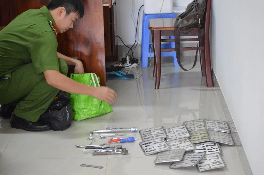 Công an thu giữ nhiều biển số, dụng cụ để mở khóa xe. Ảnh: TK
