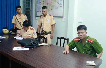 Lý Văn Lộc (bìa phải)khi bị tổ CSGT Hàng Xanh đưa về trụ sở để làm việc. Ảnh: CTV