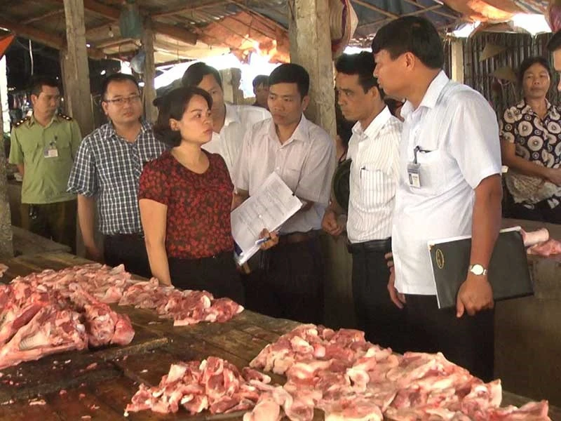 Hiện nay một miếng thịt vẫn do nhiều cơ quan cùng quản lý. Trong ảnh: Đoàn liên ngành kiểm tra thực tế vệ sinh an toàn thực phẩm tại một chợ. Ảnh minh họa: Tiến Dũng
