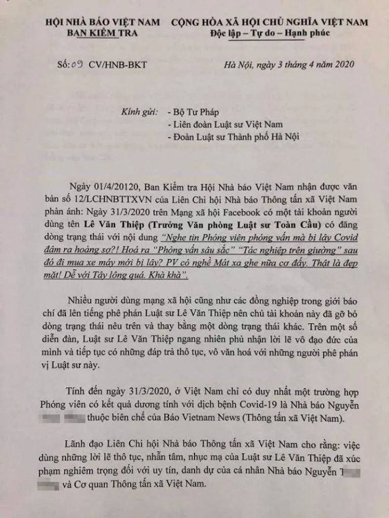 “Qua kiểm tra, xác minh theo dõi thông tin, Ban Kiểm tra Hội Nhà báo Việt Nam nhận thấy: Trong lúc cả nước đang chung tay chống dịch bệnh COVID-19, việc một luật sư dùng lời lẽ thô tục, thiếu chuẩn mực như “Tác nghiệp trên giường”, “Phóng viên có nghề mát xa ghe nữa cơ đấy” đã gây bức xúc, phẫn nộ đối với những người làm báo chân chính và dư luận xã hội” - công văn nêu rõ.