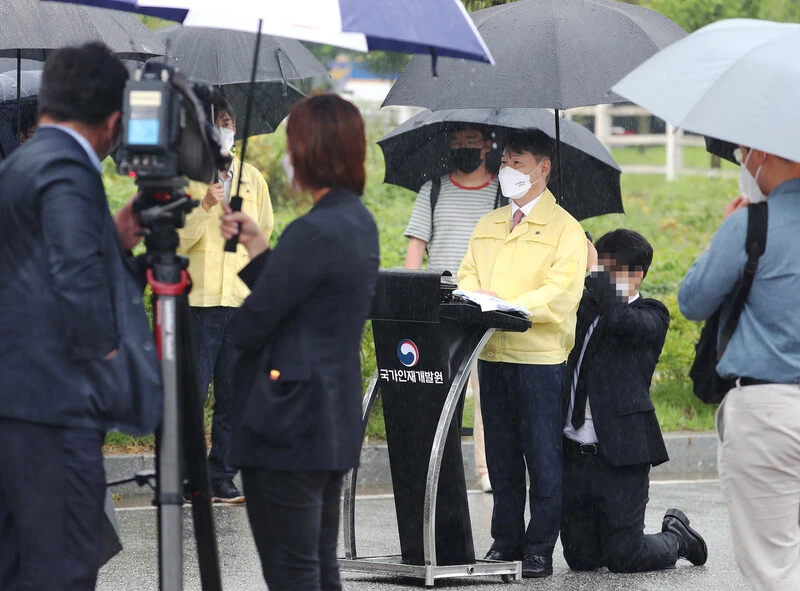 Hình ảnh người nhân viên quỳ gối che ô cho Thứ trưởng Bộ Tư pháp Hàn Quốc. Ảnh: YONHAP NEWS