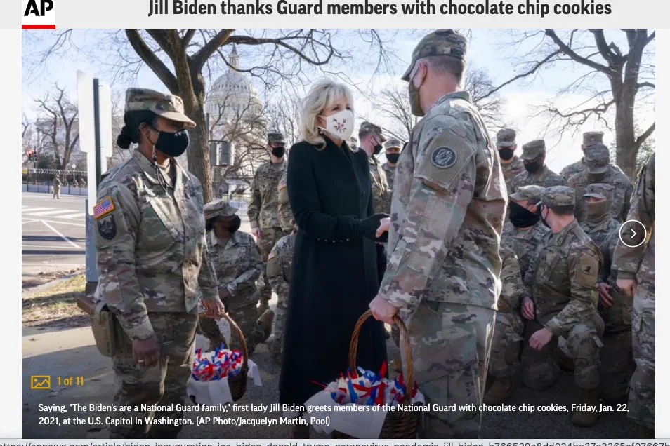 Đệ nhất Phu nhân Jill Biden đã tặng những giỏ bánh quy socola cho Đội Vệ binh Quốc gia. Bà cảm ơn họ vì đã giúp gia đình mình an toàn trong suốt Lễ nhậm chức hôm 20-1 của chồng mình – Tổng thống Joe Biden.