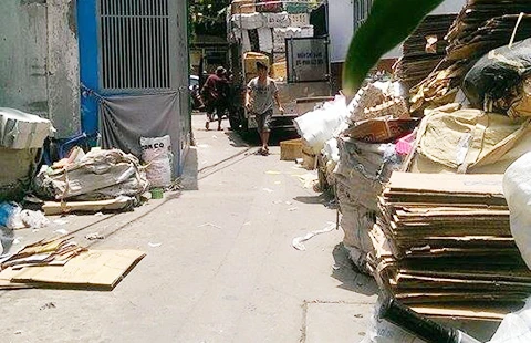 Phế liệu để tràn ra hẻm gây khó khăn cho việc đi lại của người dân. Ảnh: NGUYỄN HIỀN