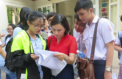 Thí sinh kiểm tra lại kiến thức sau buổi thi cuối cùng môn sinh chiều 4-7. Ảnh: P.ANH
