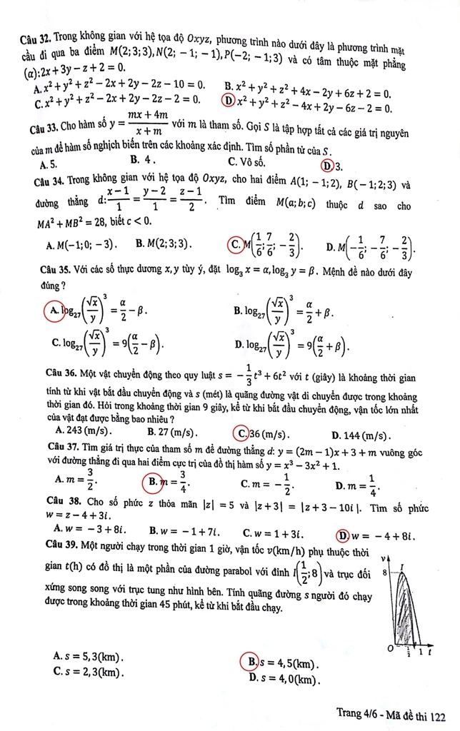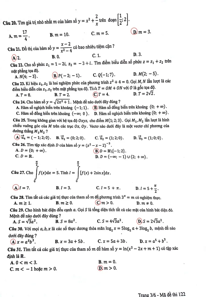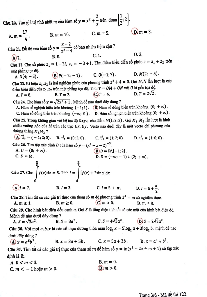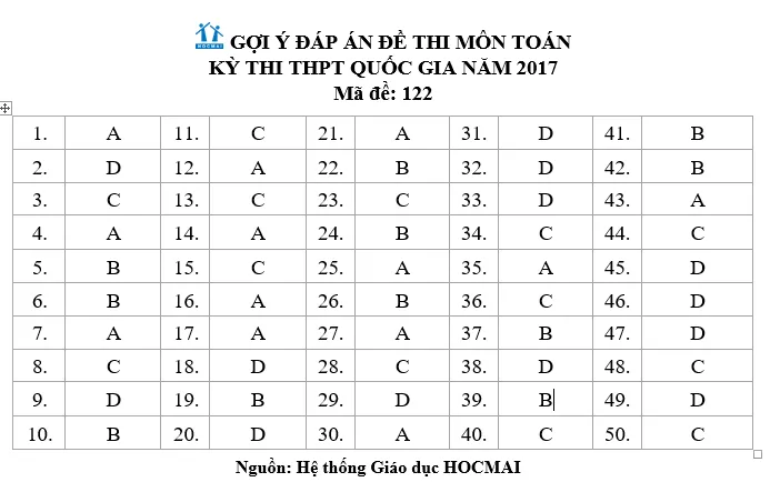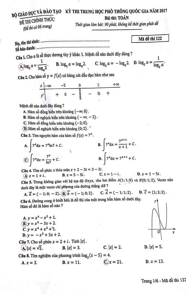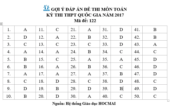 Gợi ý bài giải đề môn Toán - Mã đề 122